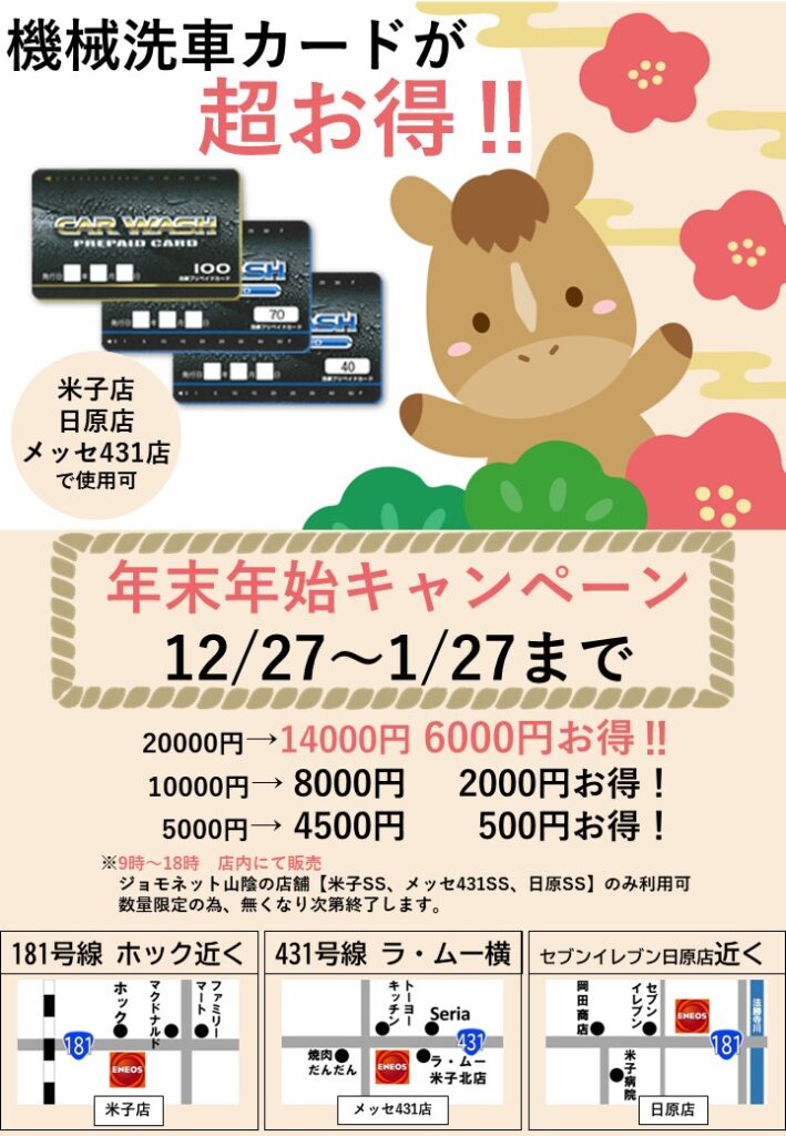 洗車機プリペイドカード「年末年始キャンペーン」を開催中です。