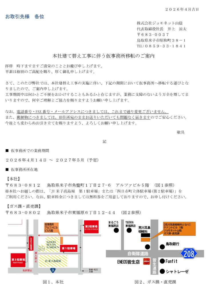 仮事務所での営業期間中は、何かとご不便をおかけする場合もございますが、これまで同様、サービス向上に努めてまいります。